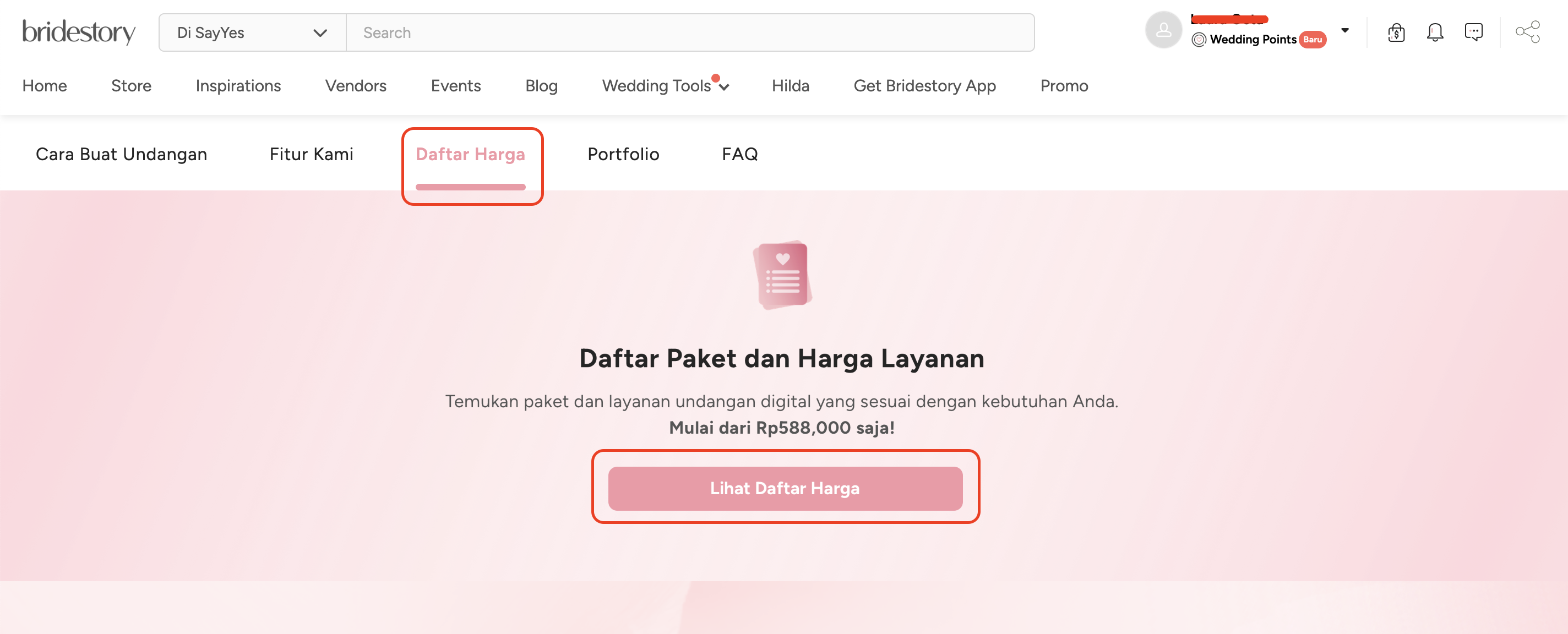 1. Buka halaman SayYes RSVP, klik menu Daftar Harga, lalu klik tombol Lihat Daftar Harga