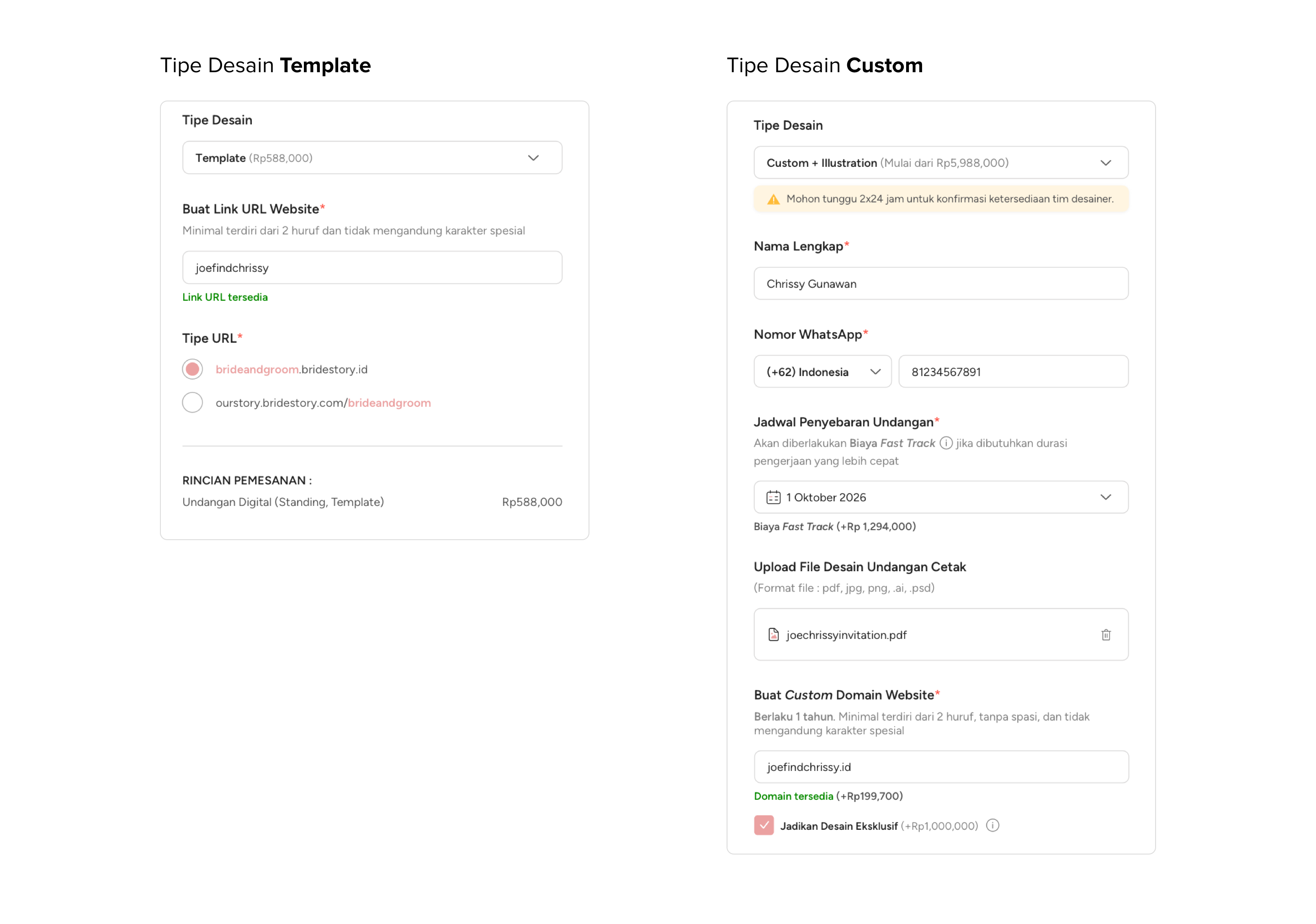 - Untuk custom design, tim SayYes RSVP akan menghubungi Anda via WhatsApp untuk koordinasi desain