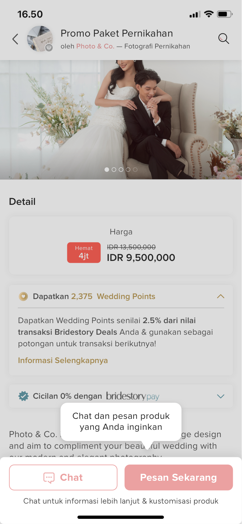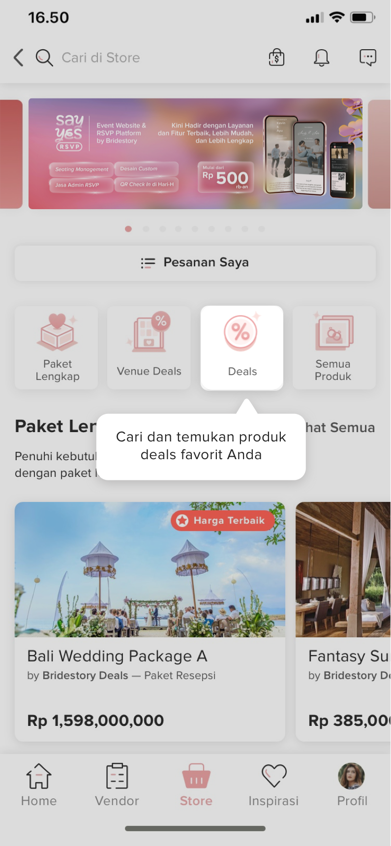 - Cari dan temukan produk favorit Anda di Bridestory Deals