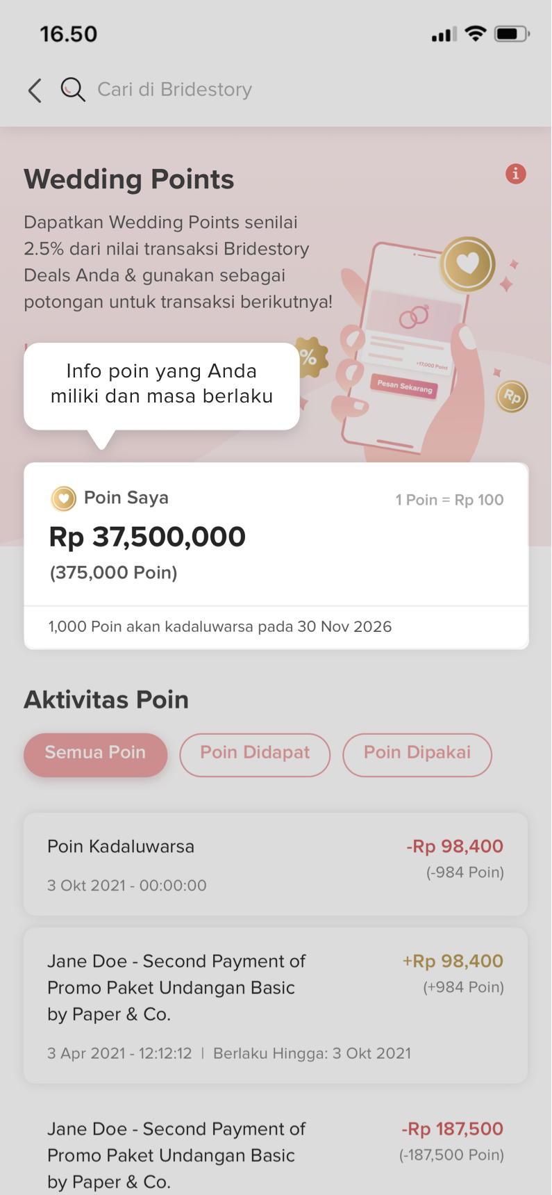 - Anda akan langsung diarahkan ke halaman dashboard Wedding Points, di mana segala informasi terkait aktivitas dan masa berlaku poin dapat Anda lihat