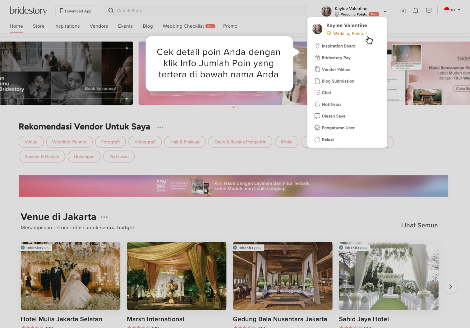 Aktivitas Wedding Points hanya tersedia jika Anda sudah pernah mendapatkan poin sebelumnya. Untuk melihatnya, Anda dapat mengunjungi halaman dashboard Wedding Points melalui website ataupun aplikasi Bridestory dengan mengikuti instruksi berikut: