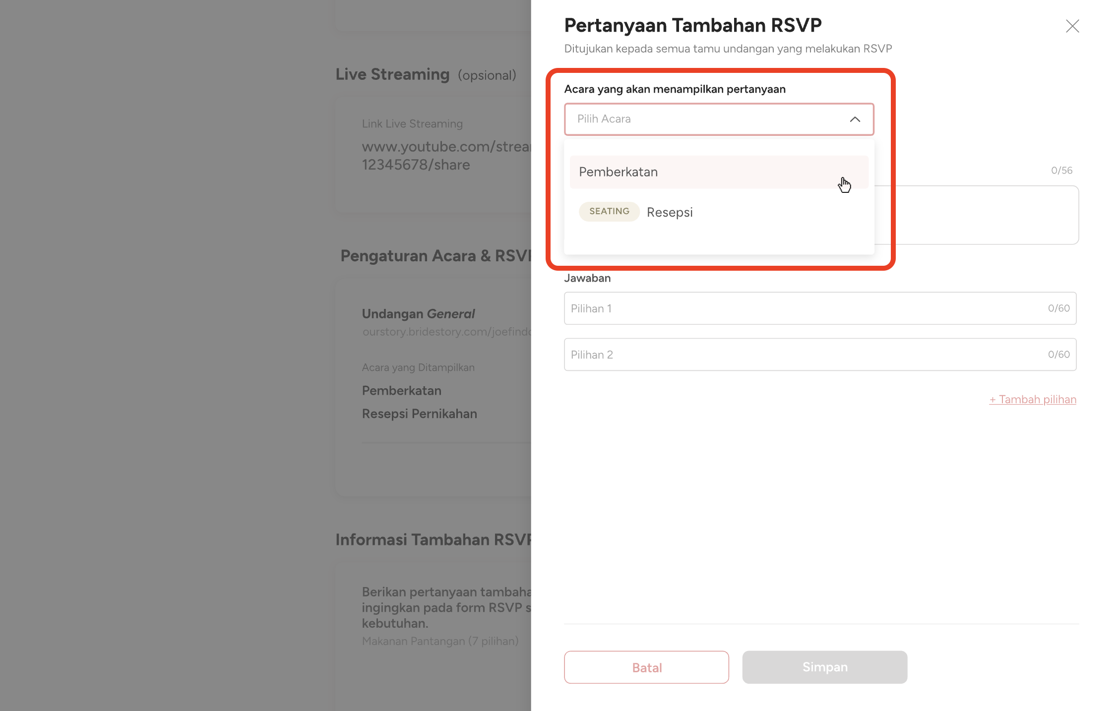 B. Pilih acara yang akan menampilkan Pertanyaan Tambahan RSVP